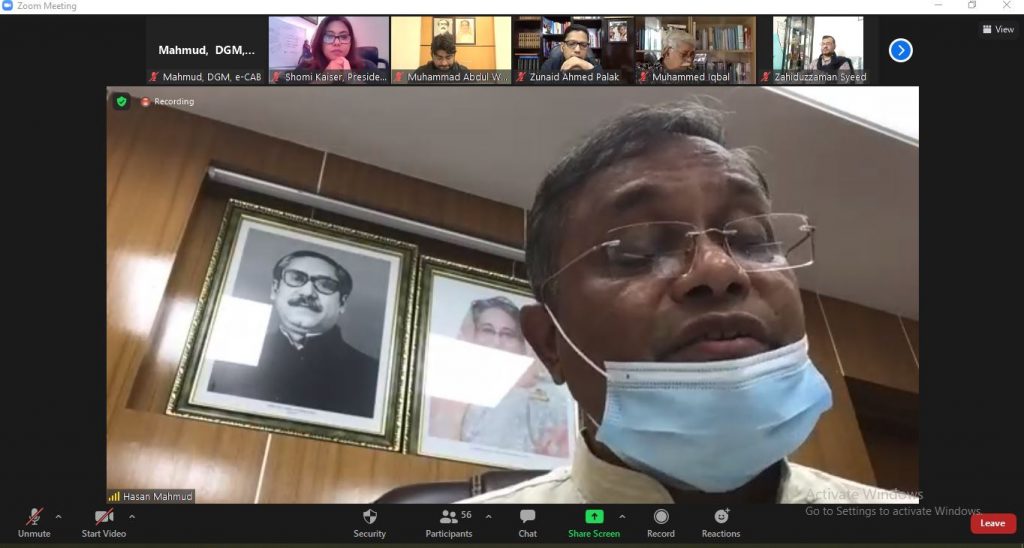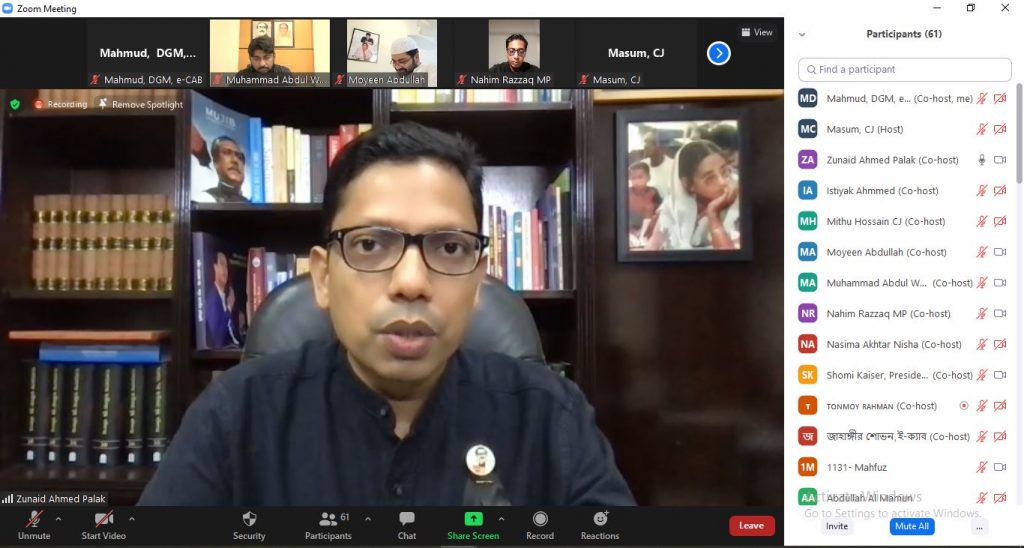 আজ বেলা ৩টায় ই-কমার্স এসোসিয়েশন অব বাংলাদেশ (ই-ক্যাব) আয়োজন করে ‘‘বঙ্গবন্ধু, বাংলাদেশ, তারুন্য ও তথ্যপ্রযুক্তি” শীর্ষক আলোচনায় সভা। জুম অনলাইনে আয়োজিত আলোচনা অনুষ্ঠানে প্রধান অতিথি ছিলেন তথ্য ও সম্প্রচার মন্ত্রী ড. হাছান মাহমুদ এমপি। বিশেষ অতিথি ছিলেন আইসিটি প্রতিমন্ত্রী জনাব জুনাইদ আহমেদ পলক এমপি। মূল আলোচক হিসেবে ছিলেন শাহজালাল বিজ্ঞান ও প্রযুক্তি বিশ্ববিদ্যালয়ের অধ্যাপক জনাব মুহম্মদ জাফর ইকবাল। এছাড়া আলোচনায় অংশ নেন ই-ক্যাবের উপদেষ্ঠা মাননীয় সংসদ সদস্য নাহিম রাজ্জাক এমপি ও এফবিসিসিআই’র পরিচালক সেরনিয়াবাত মঈন উদ্দিন আব্দুল্লাহ। সভাপতিত্ব করেন ই-ক্যাবের প্রেসিডেন্ট শমী কায়সার।